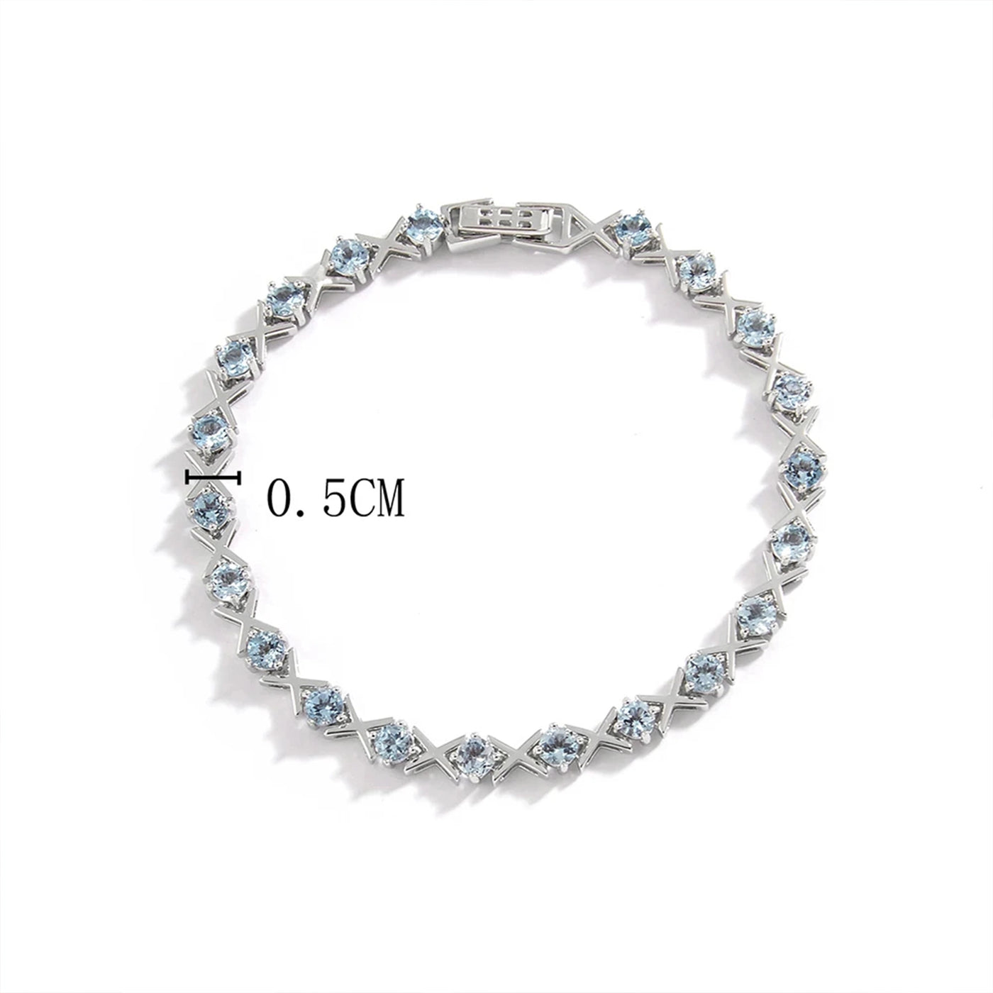A gorgeous bracelet featuring natural sky blue topaz gemstones, set in 925 Sterling Silver with an intersect fashion design. Ideal for anniversaries, banquets, or special occasions. Free shipping included.